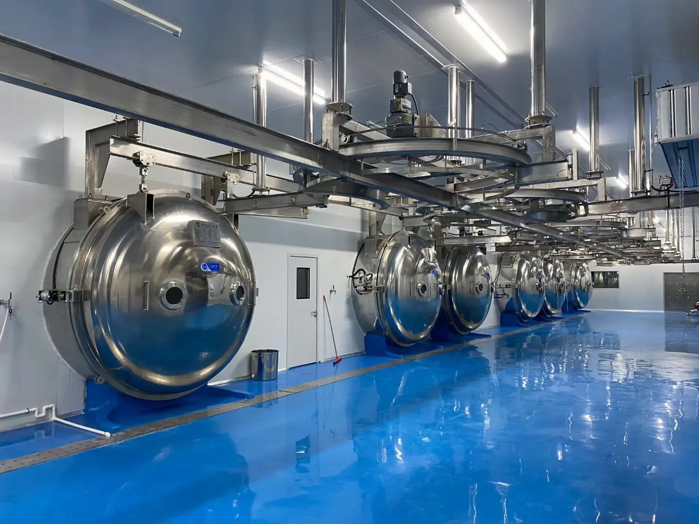 True Cold-Chain’s freeze dryers feature an automated loading and unloading system, significantly reducing labor requirements and time. Products are loaded onto trays on trolleys, which are then suspended from an overhead monorail system, allowing for swift transfer between areas such as the IQF room, freeze dryer, and cleaning facilities.